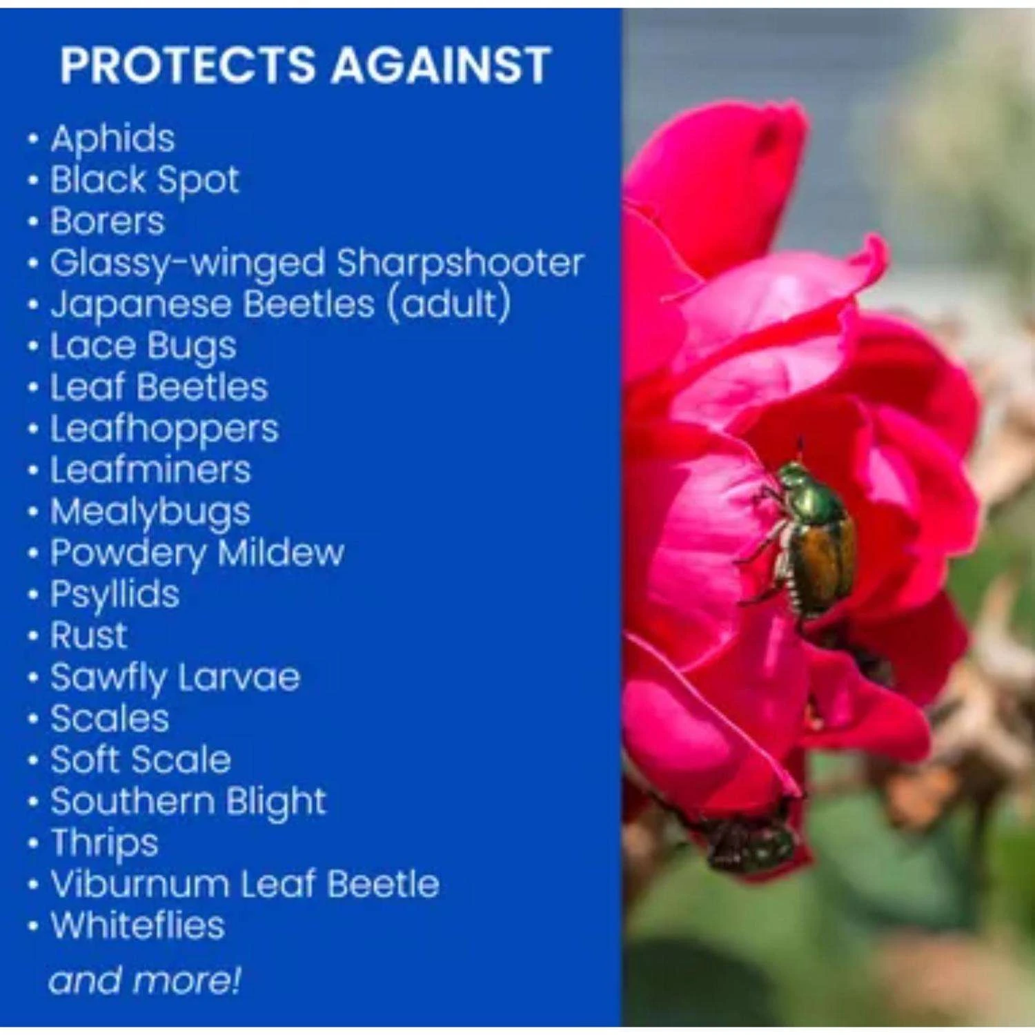 BioAdvanced All-in-One Rose and Flower Care is 3 systemic products in one. The 3-in-1 formula works as fertilizer, insect control and disease control. For roses, hibiscuses, irises and other flowers and shrubs. Just one application kills destructive listed insects such as adelgids, aphids, whiteflies and more.Any rain or water will not wash away the effectiveness of the product. 32 oz. bottle treats up to 16 rose bushes Fertilizer – Promotes strong roots and beautiful blooms Insect Control – Japanese Beetles (adult), Aphids and other listed pests Disease Control – Black Spot, Powdery Mildew, Rust and Southern Blight Convenient and easy to use – takes the guesswork out of application No spraying – just measure, mix and pour around plant base Always read and follow label instructions Systemic rainproof protection lasts up to 6 weeks Not for sale in NY Reclassified as restricted use in CT & MD