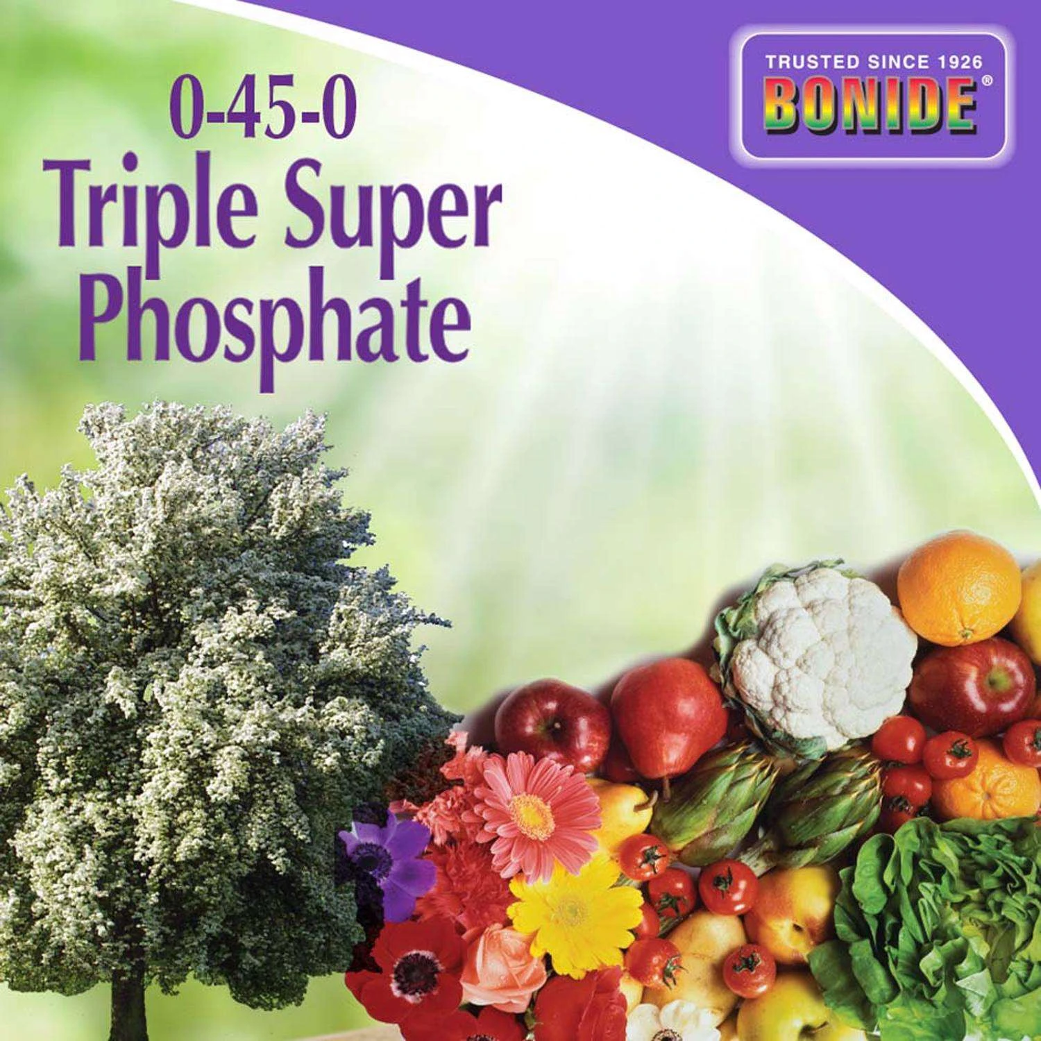 Stimulate root development and promote larger, more beautiful blooms and fruit with Garden Rich 0-45-0 Triple Super Phosphate from Bonide. Apply to a variety of plants including flowers, herbs, fruits and vegetables. The phosphorus in this fertilizer is used by plants to produce sugar during photosynthesis to encourage root growth and flower and fruit production. 0-45-0 fertilizer contains 0% nitrogen, 45% phosphate and 0% potash. This fertilizer arrives conveniently ready-to-use. Apply to plants at planting or while growing. For best results, please see product label for full use instructions and application rates. Please note, this product is packaged by weight, not volume. Stimulate root development for larger, more beautiful blooms and fruit with Garden Rich 0-45-0 Triple Super Phosphate from Bonide The 0-45-0 fertilizer formula contains 0% nitrogen, 45% phosphate and 0% potash for strong roots and beautiful blooms Apply to flowers, herbs, fruit and vegetables at planting or while plants are actively growing The phosphorus in this compound is used by plants to produce sugar during photosynthesis and to encourage root growth and flower and fruit production This product arrives ready-to-use; to use, apply at planting or while plants are growing; for best results, please see full use instructions on product label