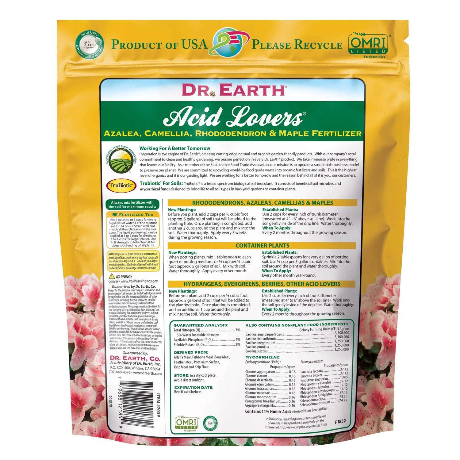 Acid Lovers dry fertilizer is formulated for acid loving plants. It is ideal for azaleas, camellias, rhododendrons, maples, hollies, gardenias, hydrangeas, blueberries, evergreens, ferns and shade plants. Excellent for use in raised beds during transplanting or feeding mid-season for a nutritional boost. People and pet safe No synthetic ingredients or GMO infested chicken manure Contains TruBiotic beneficial soil microbes plus mycorrhizae TruBiotic ensures organic nutrients are thoroughly broken down and then released in the soil for plant roots to absorb them as they are needed, contributing to drought tolerance, enhanced nutrient availability and increased plant performance Handcrafted from feed grade ingredients Enriched with organic nutrients found naturally in land plants, ocean plants, fish, fish bones and mined minerals from the earth his nutritionally balanced formula promotes very rich and healthy soil equipped to grow the healthiest plants Healthy soils are capable of growing the healthiest fruits, vegetables, trees and flowering plants in your home and garden Apply anytime midseason to supply a continual source of nutrition to maximize bulb size and color potential Feed containers every 6 weeks to keep plants healthy and strong