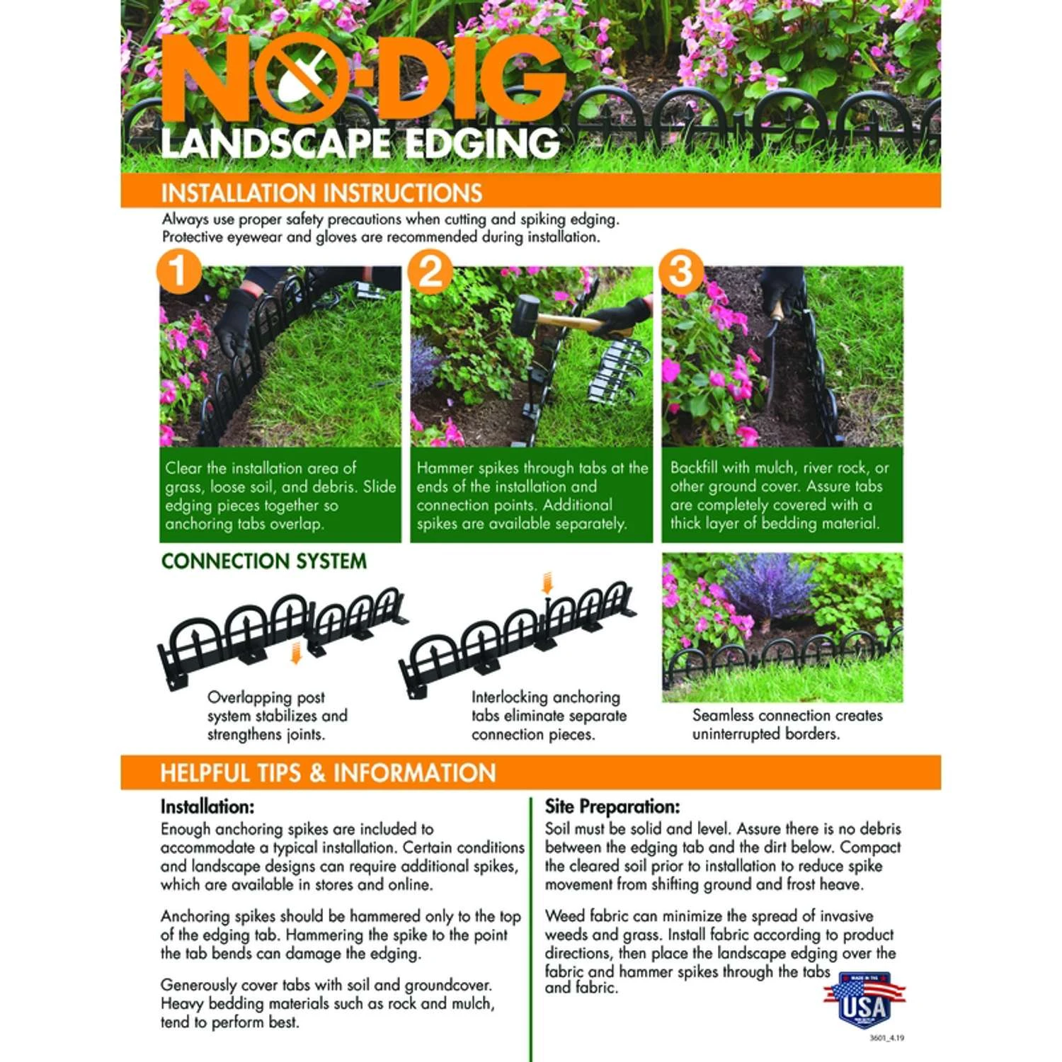 The EasyFlex Decorative Iron-Look No-Dig Landscape Edging Kit adds traditional charm to any gardening or landscaping project. The ornamental edging is flexible enough to use as a tree ring and the patented No-Dig L-shaped design eliminates damage from digging into tree and plant roots. An overlapping post system and interlocking anchoring tabs create seamless borders, eliminating the need for connector pieces. Unlike other decorative fence-style edging products, the 5 inch high edging has a built-in retaining section designed to hold back bedding materials and can be installed on top of landscape fabric to prevent weed growth. Simply clear the area of debris and align the edging to the shape of the bed. Slide edging pieces together so anchoring tabs overlap. Then use a mallet to pound the spikes (included) into the ground on each end of edging to secure. Quick and simple installation, no digging required Interlocking anchoring tabs reinforce connection points, flexible spines conform to curved border designs Overlapping post system stabilizes joints without additional connector pieces to create seamless borders Suitable for all soil types