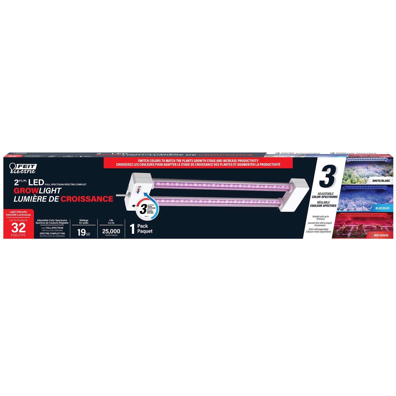 Flex your green thumb and outgrow your expectations with better and stronger growth using the Feit Electric Adjustable 3 Spectrum Dual LED Grow Light Fixture. Switch between blue spectrum light for seedling through vegetative stages, red spectrum light for stretching and flowering phase, and white spectrum light for comfortable viewing at any stage. A high CRI light makes the colors and tones of your crop radiate with boosted photogenic vibrance. These adjustable fixtures are lightweight and linkable up to 5 units. They produce significantly less heat than fluorescent lights, reducing the risk of drying out the top of your harvest. These fixtures are rated for an average lifespan of 25,000 hours/22.8 years with a damp safety location rating for growth in humid environments. The GLP24ADJS/19W/LED can be mounted flush with the ceiling or suspended with the included 6-inch wire, allowing greater light coverage of an area and adjustable distance from the light to the top of your canopy. Choose between Blue, Red, White or combinations of depending on your gardens needs Combine white, blue and red spectrum colors to focus on seeding, flowering, or plant growth Emits spectrum wavelengths and color for superior photosynthetic response Operates cooler than HPS lamps to guard against leaf burn and crop damage Linkable up to 5 fixtures