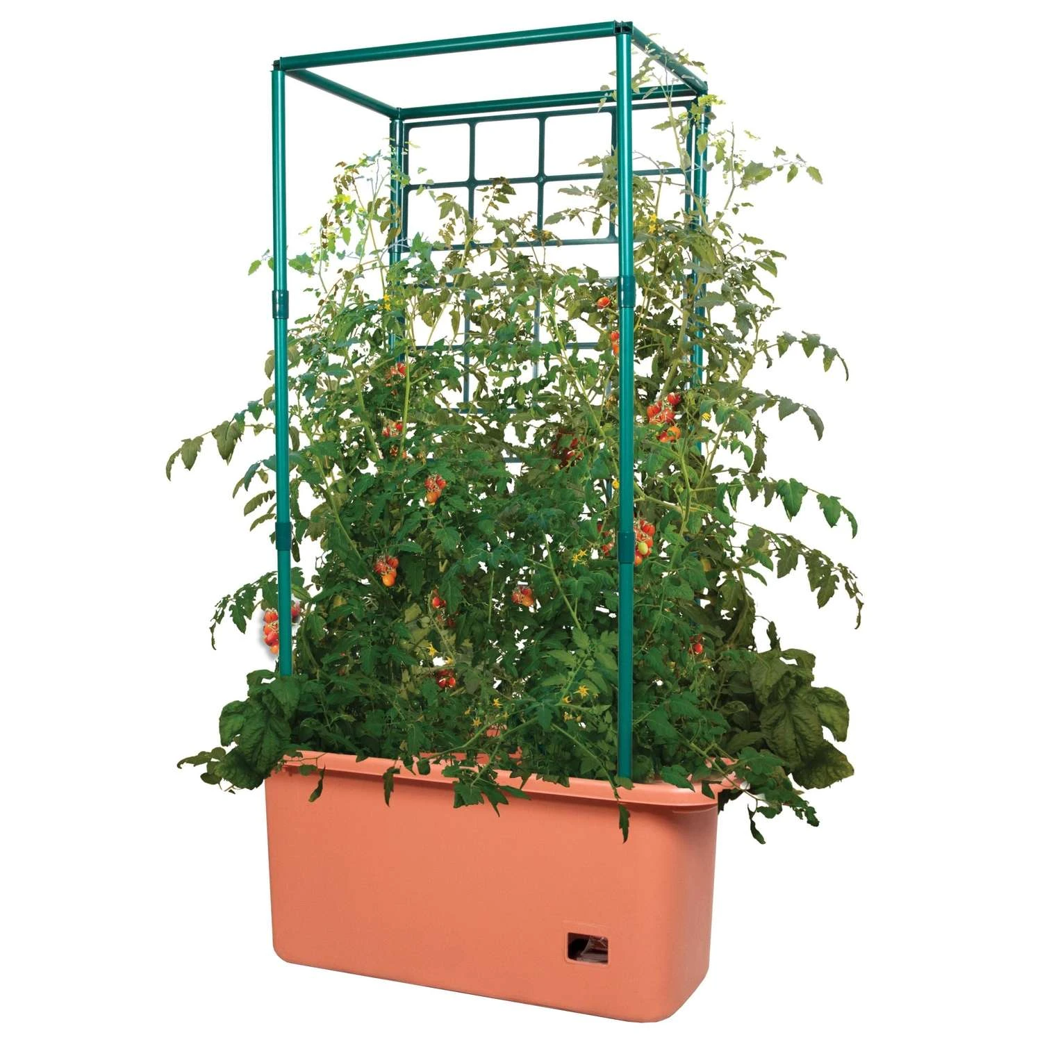 Hydrofarm’s self-watering planters provide lightweight, strong support for tomatoes, beans, peas and other climbing plants and flowers. An easy-to-fill reservoir system delivers water and nutrients from below, helping avoid over or under watering. The sturdy frame construction helps support the weight of the vines as they grow, allowing the plant to devote more energy to developing fruit and preventing the fruit from falling off before it’s ripe. Trellis expands to over 4 feet tall and snaps together Allows the plant to devote more energy to fruiting and less to vines and support stems Entire unit on wheels makes for easy movement which saves on lifting Holds approximately 10 gallons of media