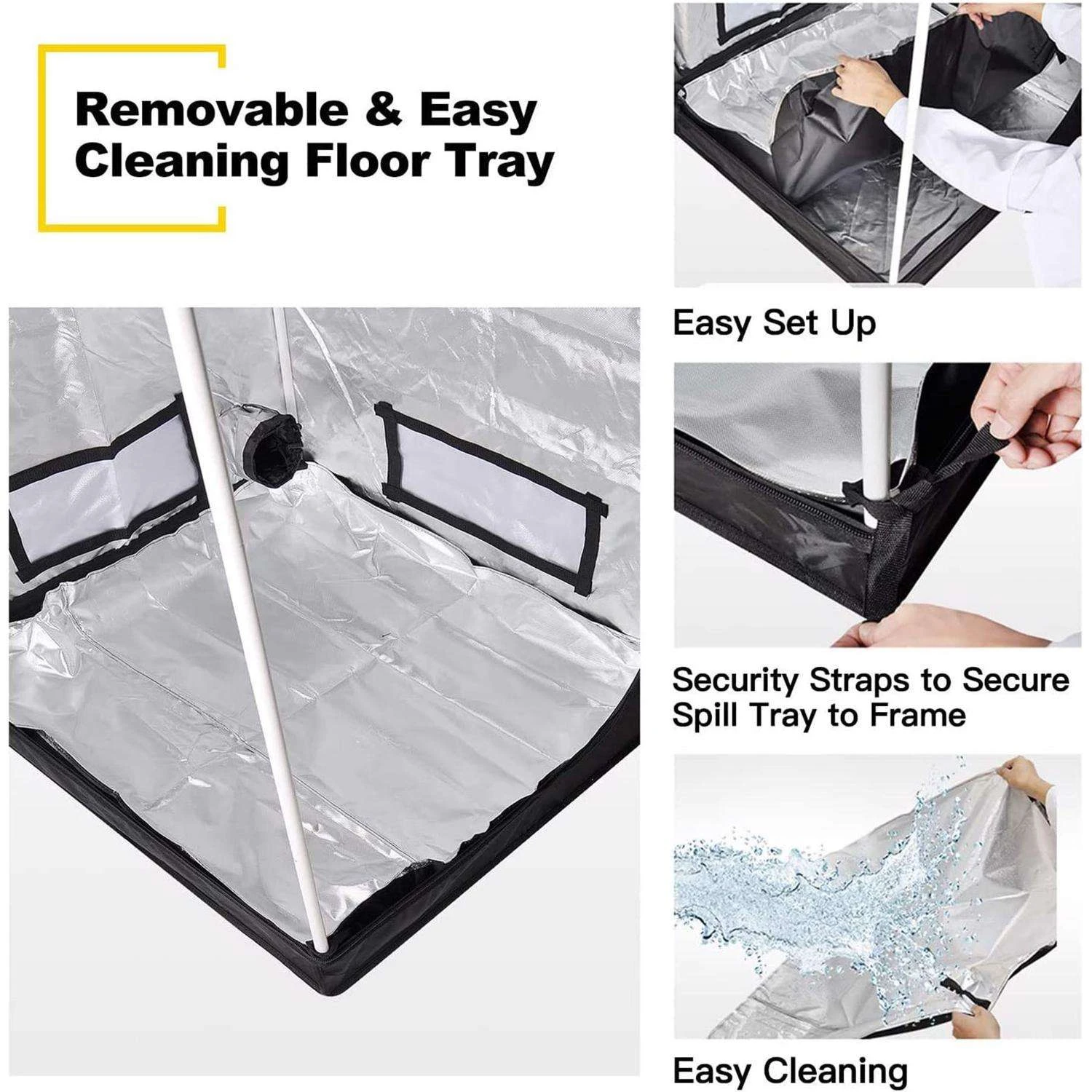 iPower grow tent is made of high quality oxford fabric. It is tear proof, water-resistant, wear-resistant to block all light from escaping and lined with 98% reflective mylar to boost the output efficiency of any grow tent setup. Our heavy duty Zippers & Double Stitching protect the tent from light leaking and ensure durability and long-lasting use. Zipper with black lining create a light-proof seal without need for additional flaps and self-adhesive tape. Strong metal poles and solid metal corner connectors are rated to handle at least 110 Ibs. The frame is specially finished to ensure smooth installation and safe handling. Our easy-access door unzips smoothly and the observation window makes it easy to peek inside. The tent comes with tool bag and removable floor tray, it is convenient for you to keep the tools and accessories organized. Removable waterproof tray easy to set up and clean Easy to assemble and use, no tools needed Sturdy all-metal frame rated to handle at least 110 lbs. for the grow lights, filters, fans