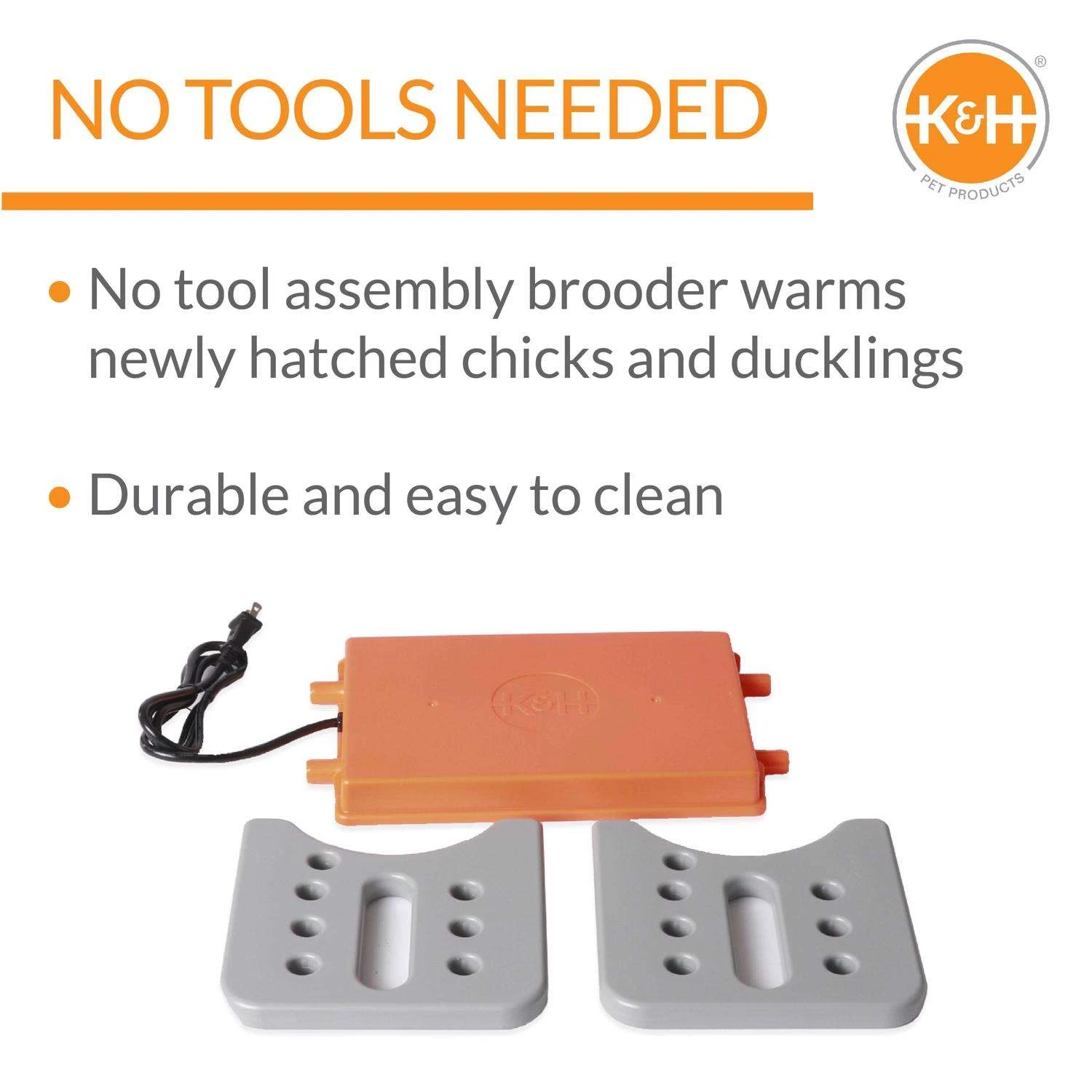The K&H pet products thermo-poultry brooder heater is the safest, easiest, and most economical way to provide added warmth for newly hatched chicks or ducklings. The unique pegged shelf provides an adjustable height system that allows you to adjust the brooder heat plate to be used even as chicks begin their growth spurt. Available in two sizes; at only 25 watts for the small and 40 watts for the large, the K&H thermo-poultry brooder will be a staple product for years to come. Why use dangerous brooder heat lamps when there is a safe alternative. This heated brooder for birds has been tested certified by met labs and exceeds USA/CA electrical safety standards; K&H doesn’t just use safety listed parts; we safety certify the entire product. Designed by K&H with over 20 years of experience in creating safe, innovative, quality products for pets; two-year limited warranty. No tools required for assembly An indicator light to confirm the brooder is in use Brooder heater is easy to clean Exterior is extremely durable