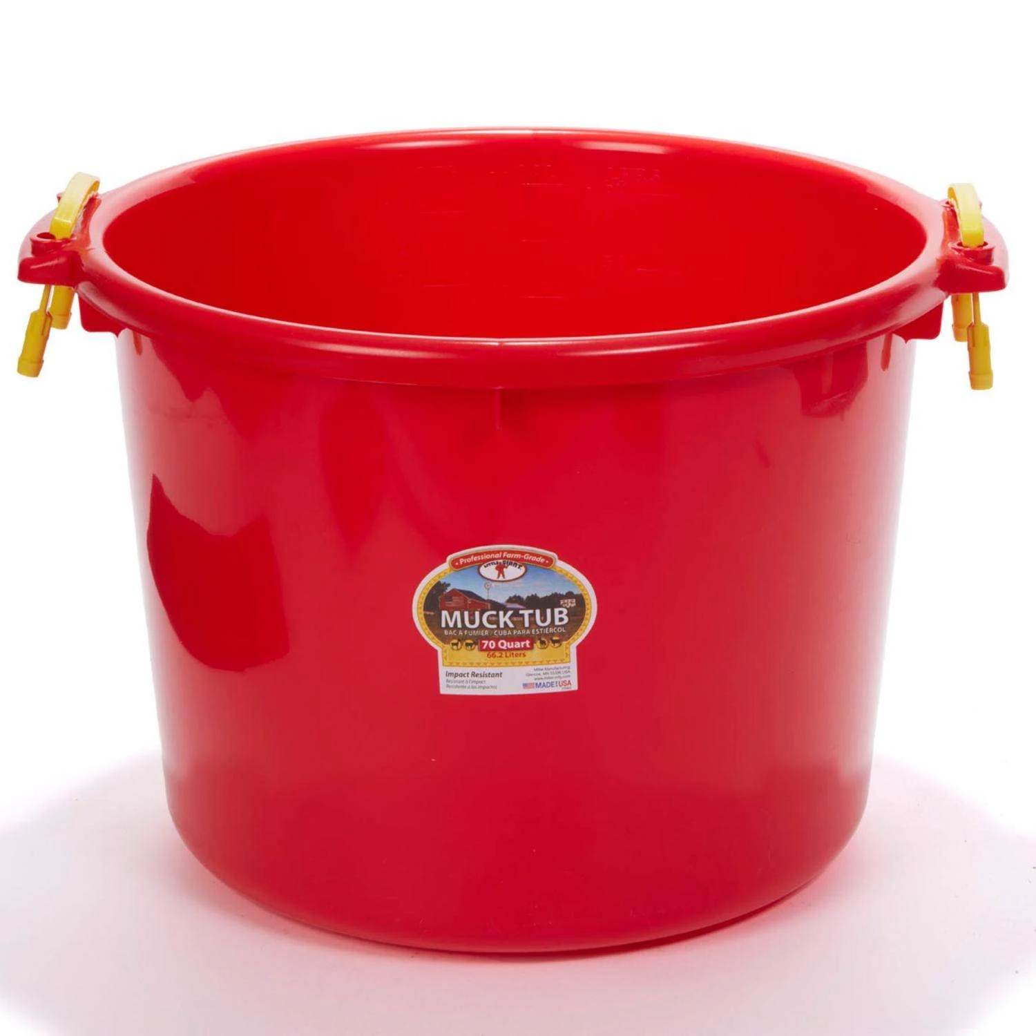 The perfect solution to a never-ending problem. The Little Giant 70-quart Muck Tub can help you handle big or small cleanup jobs with ease. The ample mouth size lets you load it up fast and the poly rope handles are strong and comfortable carrying. Tub for moving soiled bedding, manure, and other materials The plastic handles are tested 2x stronger than rope and feature a molded grip for comfortable carrying * High-density polyethylene tub holds 70 quarts (17.5 gallons) Also available in 40-quart size and other colors Tub fits perfectly on the Little Giant Multi-Purpose Muck Cart (Item No. CA500, sold separately)