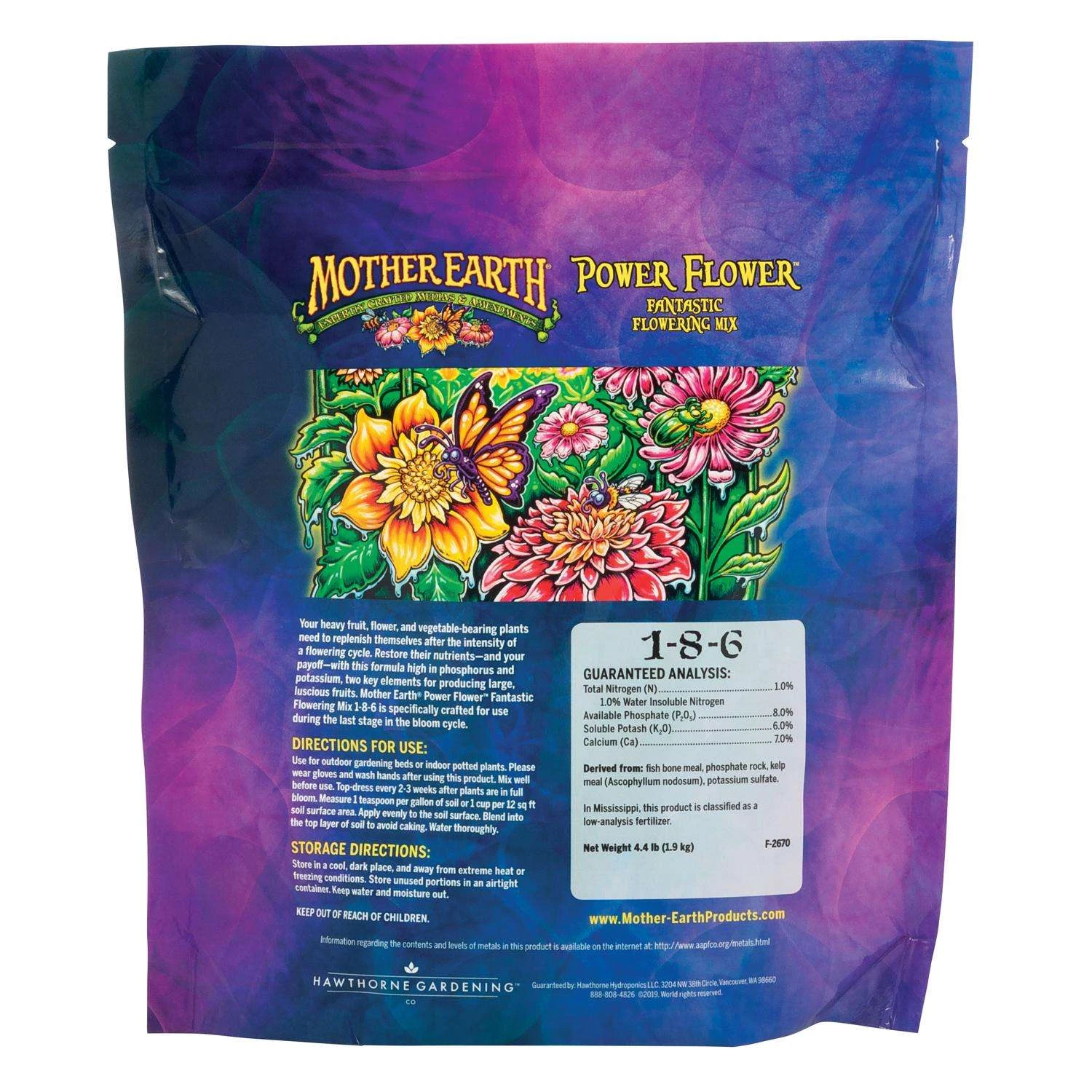 Mother Earth Power Flower Fantastic Flowering Mix 1-8-6 is a granulated fertilizer for flower- and vegetable-bearing plants. Your heavy fruit-, flower- and vegetable-bearing plants need to replenish themselves after the intensity of a flowering cycle. Restore their nutrients – and your payoff – with this formula high in phosphorus and potassium, two key elements for producing large, luscious fruits. Mother Earth Power Flower Fantastic Flowering Mix 1-8-6 is specifically crafted for use during the last stage in the bloom cycle. Good for flower- and vegetable-bearing plants Restores plant nutrients after flowering cycle High in phosphorus and potassium, two key elements for producing large, luscious fruits Use while plants are in full bloom as directed by top dressing soil every 2-3 weeks Use in many types of growing environments and medias including soil, coco, hydroponic, raised beds, pots, in ground, indoor and outdoor
