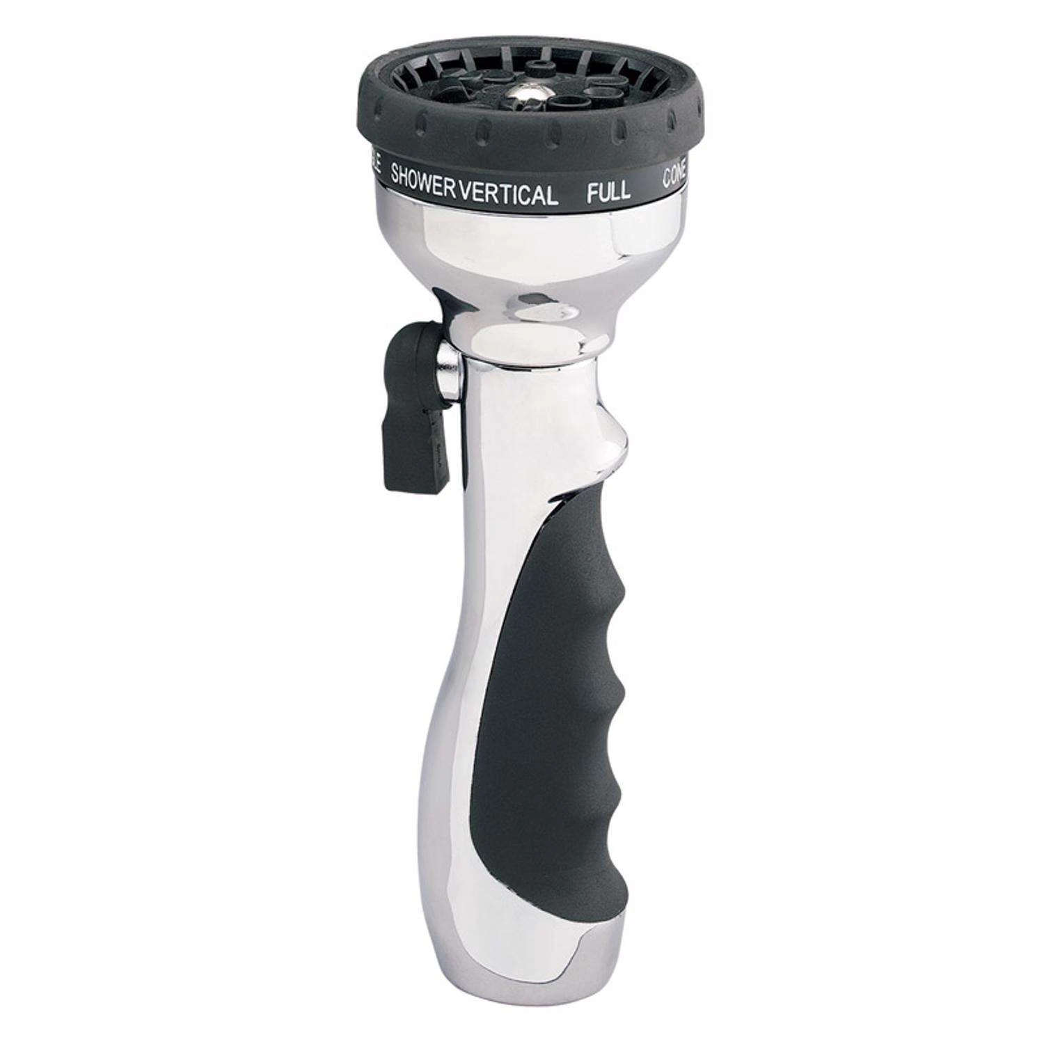 The aluminum multi-pattern torch reduces hand fatigue by comfortably fitting the shape of your hand. Choose between ten unique spray settings ranging from a powerful jet spray to a soft, rain-like shower. Contoured handgrip provides ergonomic fit Control water flow with the fingertip lever Ten spray patterns, one for every task in the yard Thumb-operated shut-off lever controls
