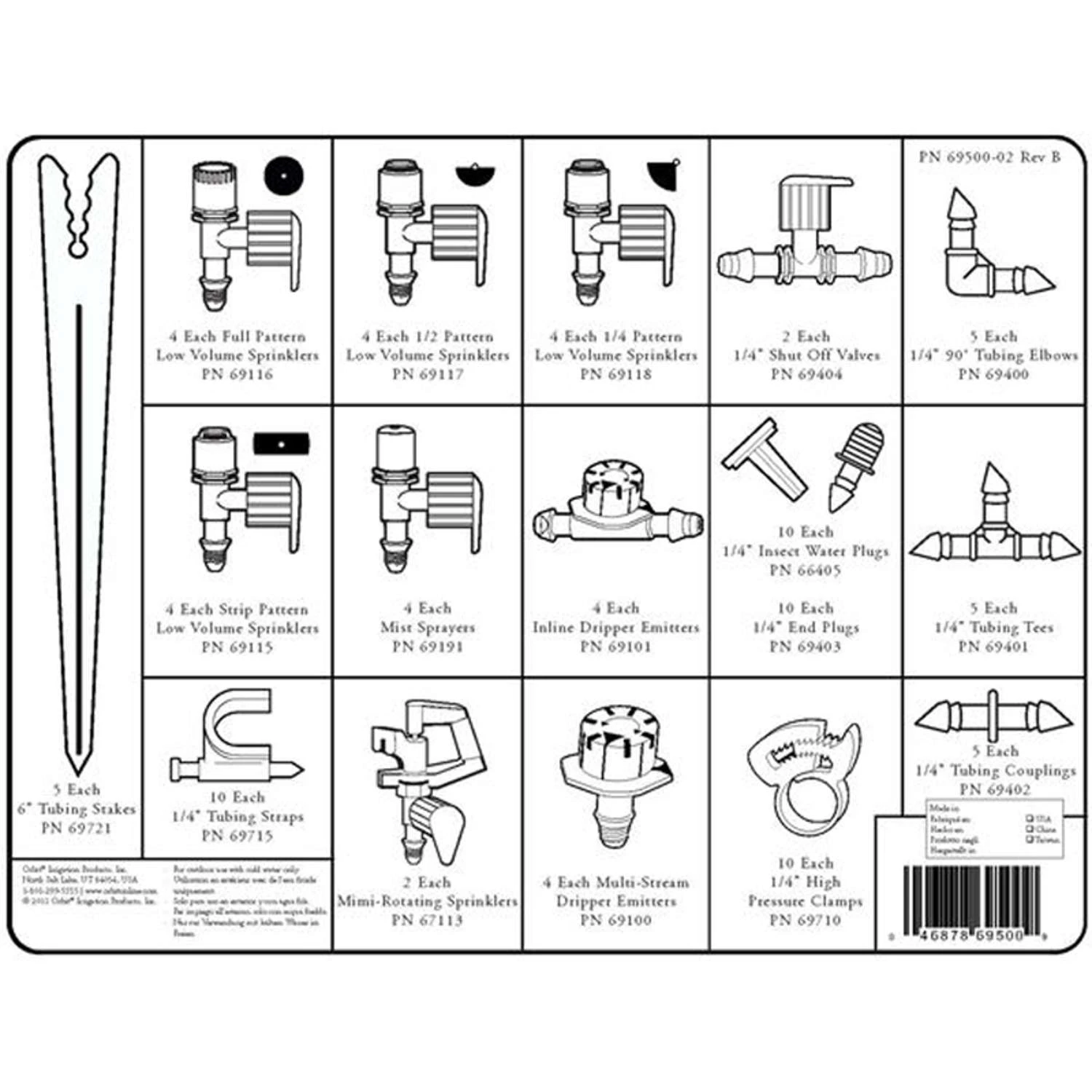 In one, refillable case you have got everything you need to repair or even install a drip irrigation system. Elbows, tees, inline connections and a variety of sprinklers, a perfect assortment of 1/4-inch drip irrigation fittings to be used with 1/4-inch pipe. Saves water in drought conditions Handy, refillable case keeps fittings organized Contains the most common and recommended fittings, sprinklers and accessories Kit pieces and parts work with most new drip systems