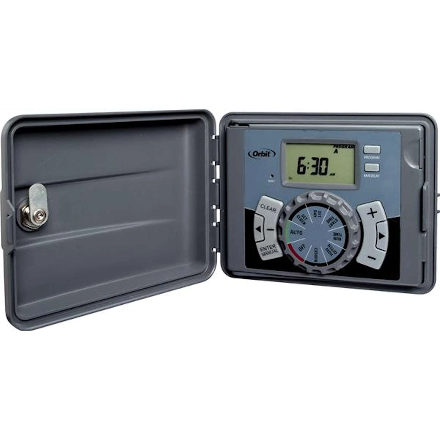 The Orbit Easy-Set Logic Sprinkler Timer takes the guesswork out of watering by helping you set a customized watering schedule for your lawn. It comes in a weatherproof cabinet, with internal transformer, for easy indoor or outdoor plug-and-go installation with hassle-free programming. Timer can be mounted indoors or outdoors 3 programs for flexible scheduling Rain delay options of 24, 48 or 72 hours Swing panel timer for easy wiring access Large LCD and dial