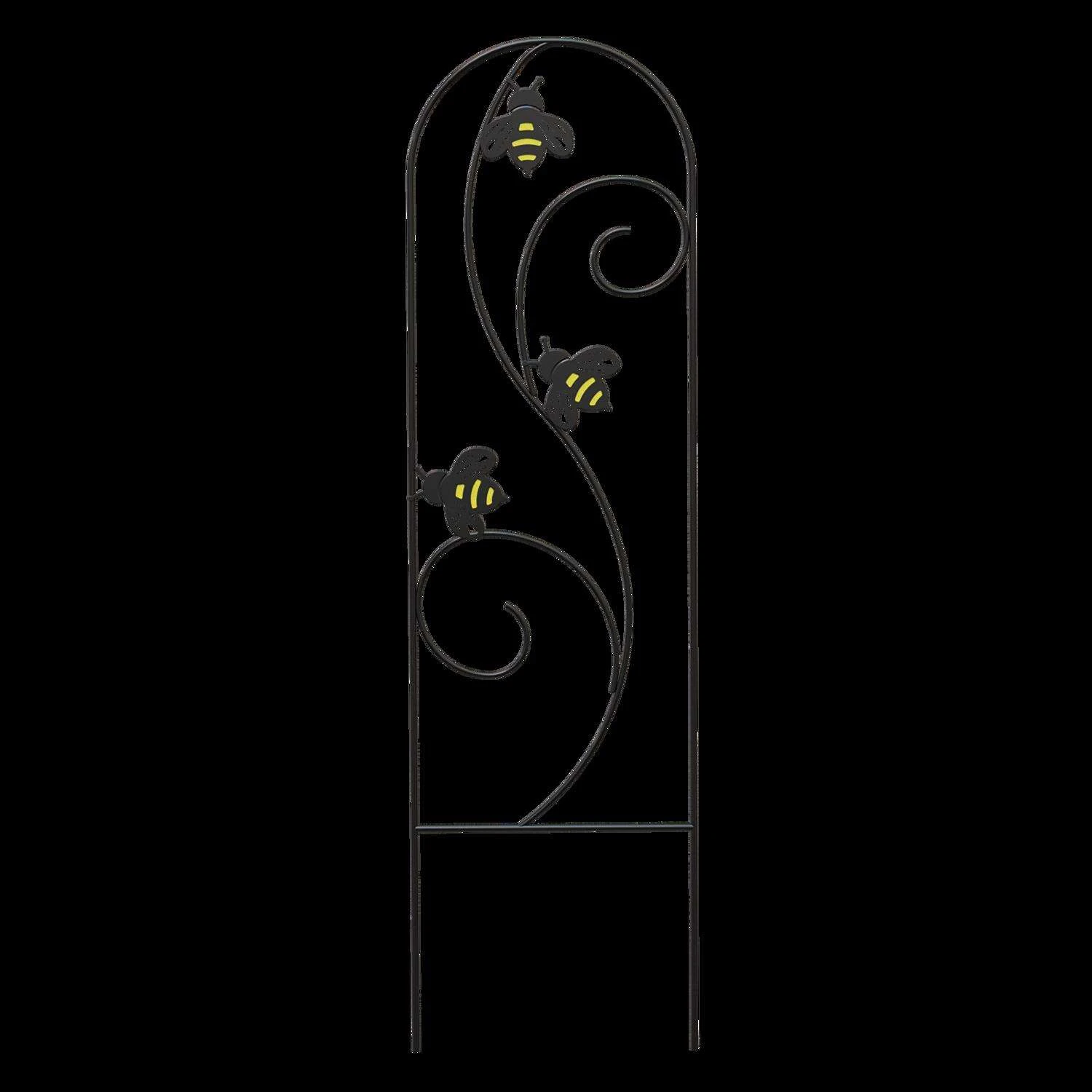 Bee-Conscious Garden Decor is decor on a mission to educate and decorate; bees are responsible for pollinating about 1/3 of our food supply. Give your potted plants and climbing blooms a sturdy trellis to climb with this pot trellis embellished with whimsical bees, base stakes fit in a 10-in diameter or wider pot. Creates a support for climbing vine plants, like clematis, honeysuckle and other flowering vine plants as they wrap around the curved vine design. This trellis can also stand on its own using the base stakes set in soil or set it against fencing, exterior walls. Durable steel is welded to give the trellis strength and features a powder coating for added rust resistance. Matte black powder coated finish for durability Fits in a 10-in diameter or wider pot Perfect for climbing flowers and vines Easy to use