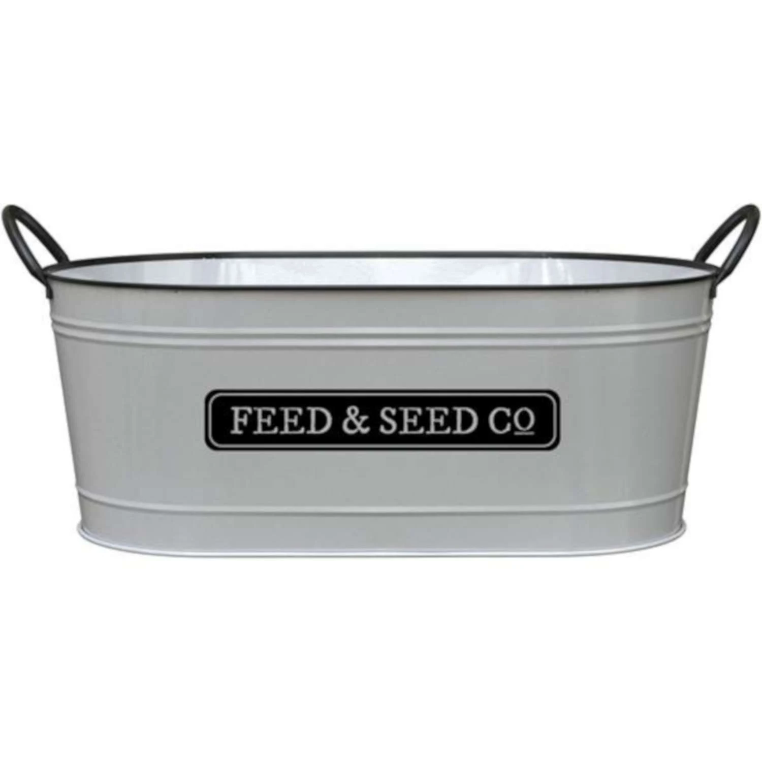 Decorate your table with a chic and trendy Milkhouse Feed & Seed Oval Planter! The 16 in. long oval planter has a fresh white enamel finish and charming Feed and Seed printed on the side, reminiscent of old fashioned country store signs. Fill it with roses, sunflowers or a beautiful garden mixture for a colorful flower arrangement! Featuring the words “Feed and Seed Co.” this vintage inspired oval planter will be charming when filled with houseplants or garden blooms. Electrostatically powder coated for added rust resistance Vintage, distressed appearance Sturdy and durable