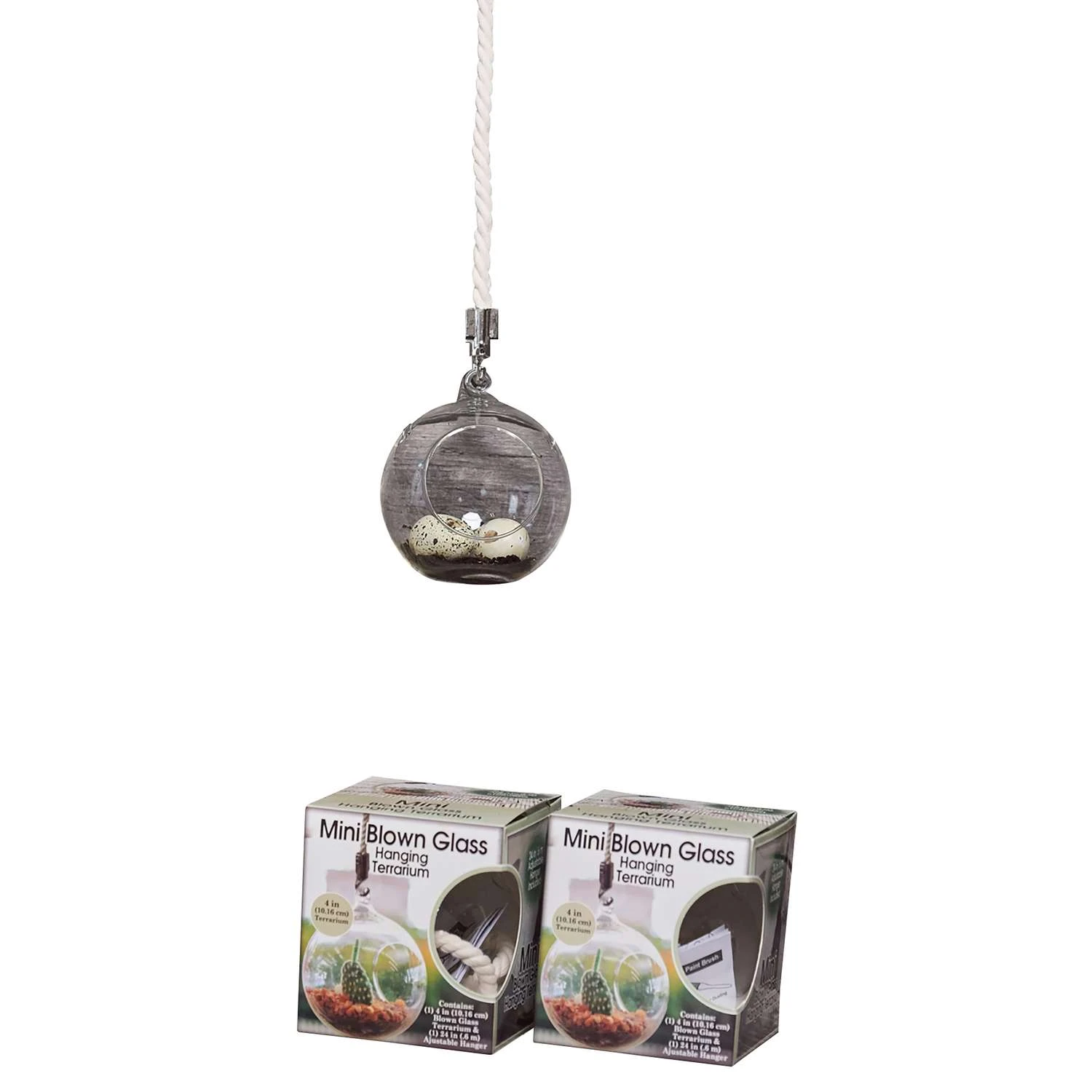 The mini glass terrarium with hanger is a great gift boxed item. This item comes with a 4 in. mini glass terrarium and a 24 in. cotton drop hanger all in one box. Want a shorter hanger. Simply use a Philips screwdriver to remove one hook, cut to desired length and reattach hook. Perfect gift item. Use with Primitive. Planters s-hooks or hanger hooks for easy displaying Use this hanging glass terrarium to display your favorite air plant Great gift idea for the avid gardener and all holidays