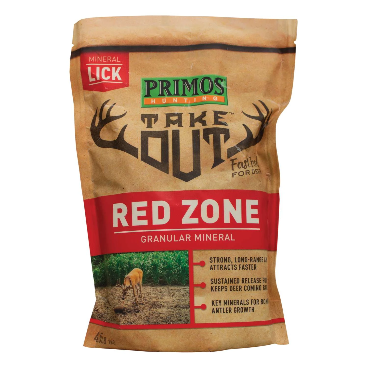 Take Out Red Zone gives hunters in every region and condition a granular mineral that reaches out with an aroma to quickly attract bucks. Strong, long-range aroma attracts faster Sustained release formula to keep bucks coming back Key minerals for bone and antler growth Consistent attraction from early to late hunting seasons