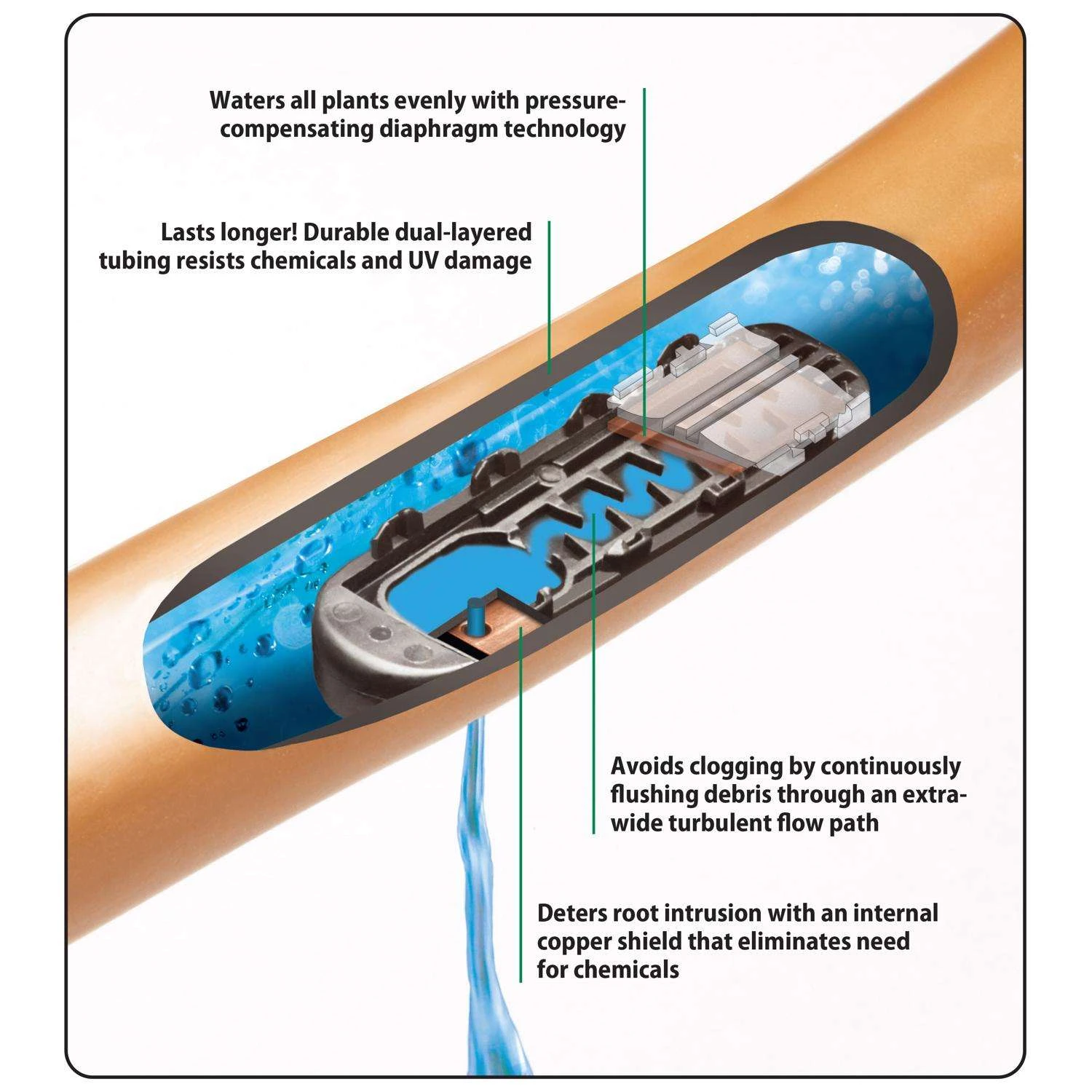 Rain Bird’s copper-colored subsurface emitter tubing with copper shield provides 90% watering efficiency, right at the root zone. Rain Bird’s patent-pending copper shield technology protects the emitter from root intrusion, creating a long-lasting, low maintenance sub-surface drip irrigation system for use in organic gardens or shrub and groundcover areas. Having the copper color outside ensures the copper chip is inside and that your dripline is protected from root intrusion. Required Filtration: 120 mesh Copper color outside ensures that the copper shield is inside The pressure-compensating emitter design provides a consistent flow over the entire lateral length ensuring higher uniformity for increased reliability in the pressure range of 8.5 to 60 psi Dual-layered tubing (copper over black) provides unmatched resistance to chemicals, algae growth and UV damage Rain Birds proprietary emitter design resists clogging by use of an extra-wide flow path combined with a self-flushing action Plants are watered uniformly with pre-installed, pressure compensating emitters spaced every 18″ 0.700 in. OD, 0.580 in. ID Standard male and female hose thread ends, with removable end cap Water Temperature: Up to 100°F (37,8° C) Ambient Temperature: Up to 125°F (51,7° C)