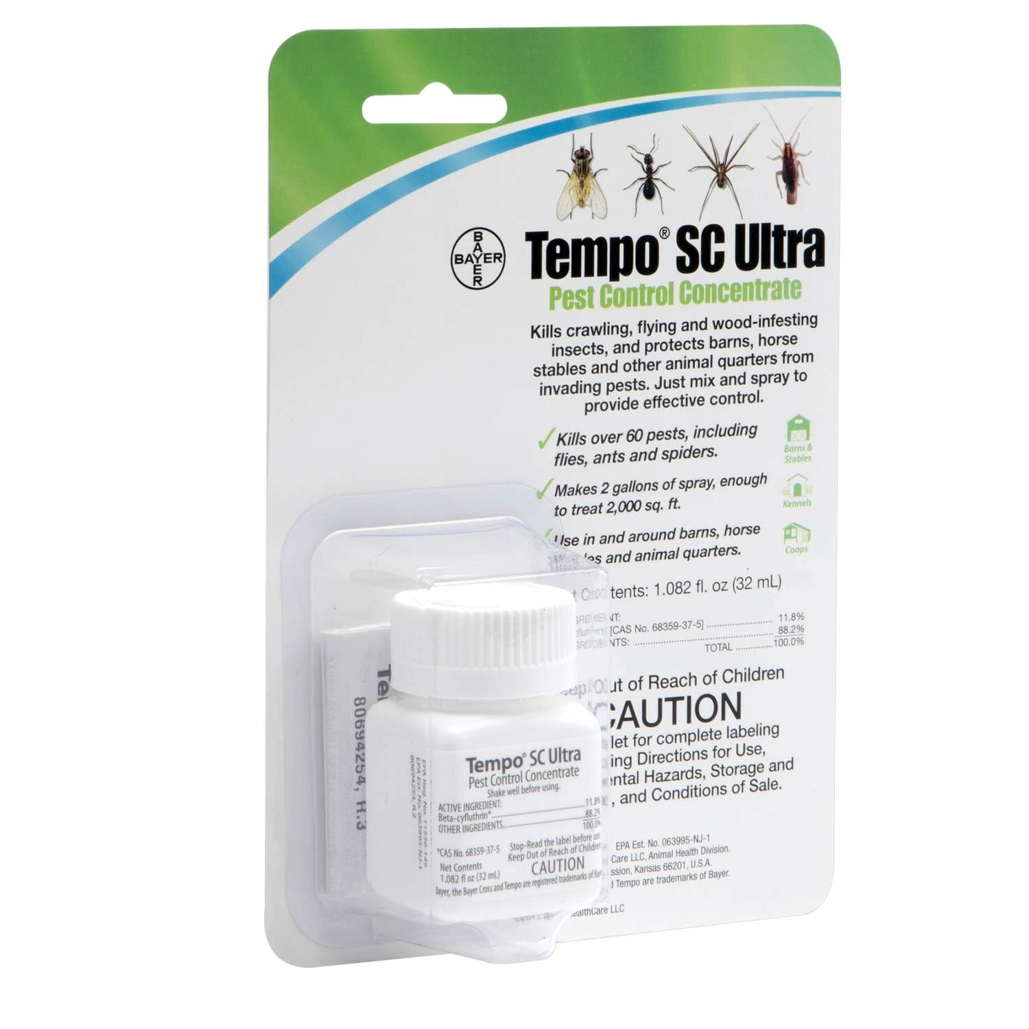 Tempo SC Ultra concentrate is the professional strength insecticide now available for consumer use. Same proven ingredients with much less cost. Acts fast to keep crawling and flying insects under control for up to 4 months. Tempo is 4-6 times more effective than 3rd generation parathyroid insecticides. Tempo SC ultra concentrate kills over 60 flying and crawling pests, including flies, ants and spiders Highly effective, fast knock down lasts up to 4 weeks Safe for use in and around barns, horse stables and animal quarters Makes 2 gallon of spray enough to treat 2000 square feet