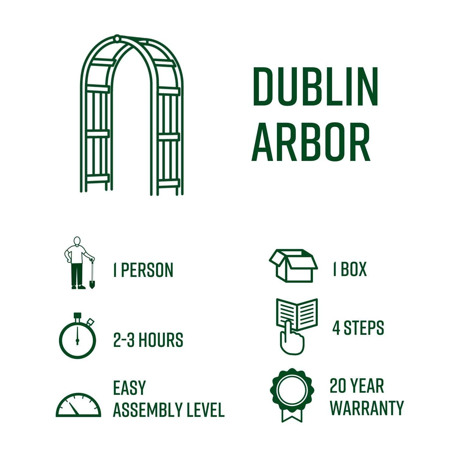 The Dublin Arbor offers a tasteful sensibility to any outdoor space and will make yours a yard of distinction. The decorative side spindle design creates an impressive entrance to any yard, garden or pathway. Crafted with premium weather-resistant vinyl, the Dublin Arbor is maintenance-free and built to last. Simple to assemble and install and comes with a 20-year warranty Material: Crafted from durable BPA/phthalate-free vinyl Decorative side spindle design Maintenance free: Easy to maintain and clean 20-year warranty against material defects