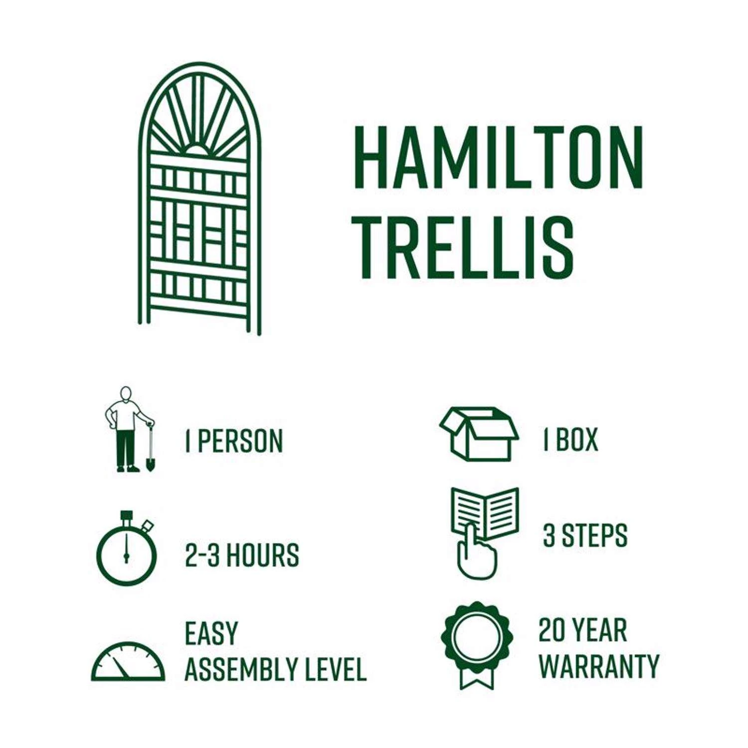The Hamilton Trellis is a traditionally designed and compact. The 35-cell lattice supports climbing plants and flowers to create a dynamic accent wall or privacy screen. Crafted with premium weather-resistant vinyl, the Hamilton Trellis is maintenance-free and built to last. Simple to assemble and install and comes with a 20-year warranty. Material: Crafted from durable BPA/phthalate-free vinyl Lattice detail to support your climbing plants and flowers Maintenance free: Easy to maintain and clean 20-year warranty against material defects
